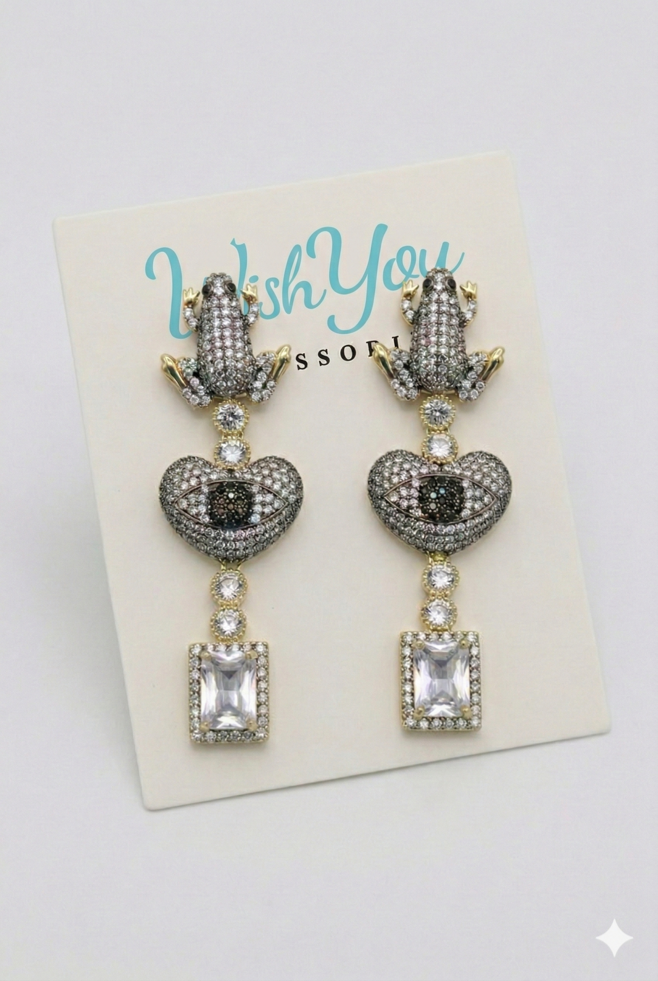 Farklı ve dikkat çekici tasarımıyla öne çıkan göz kurbağa küpe, kurbağa figürü, göz detayı ve taş süslemeleriyle özgün bir stil sunar. Parlak taşlarla kaplı yapısı sayesinde ışıltılı bir görünüm kazandırırken, sallantılı formu kombinlerinize hareket katar. Kadın küpe modelleri arasında sıra dışı tasarımıyla öne çıkan bu küpe, stilinize cesur ve şık bir dokunuş ekleyen özel bir aksesuardır.